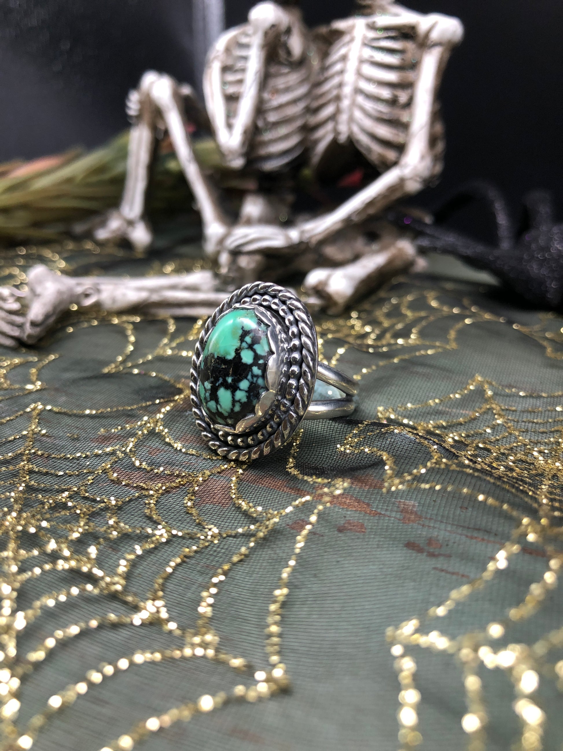 Handmade sterling silver ring set with a New Lander Variscite stone. Bead and flower accents.