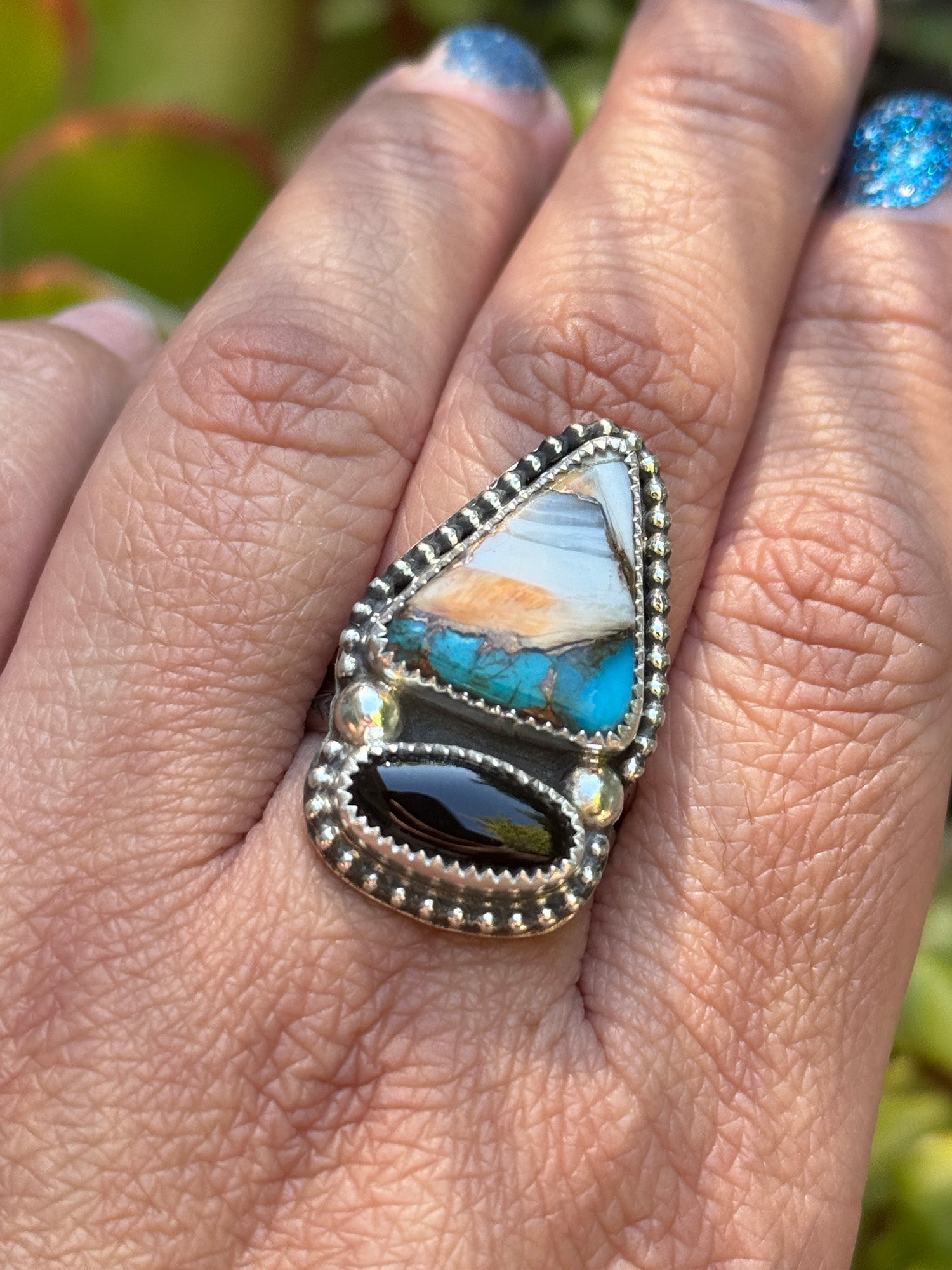 Ring is set with a Spiny Oyster Turquoise stone. This Mojave stone is a combination of Kingman Turquoise, White Buffalo and bronze.