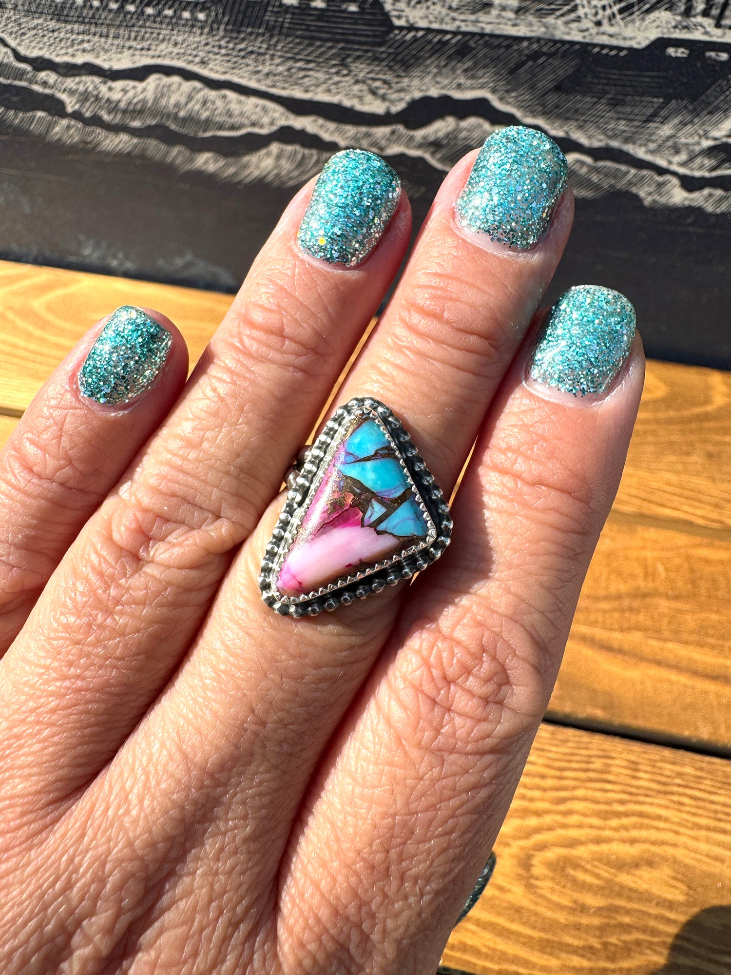 Ring is set with a Pink Dahlia. Other wise known as a Mojave stone is a combination of dyed Spiny Oyster, Turquoise and Bronze