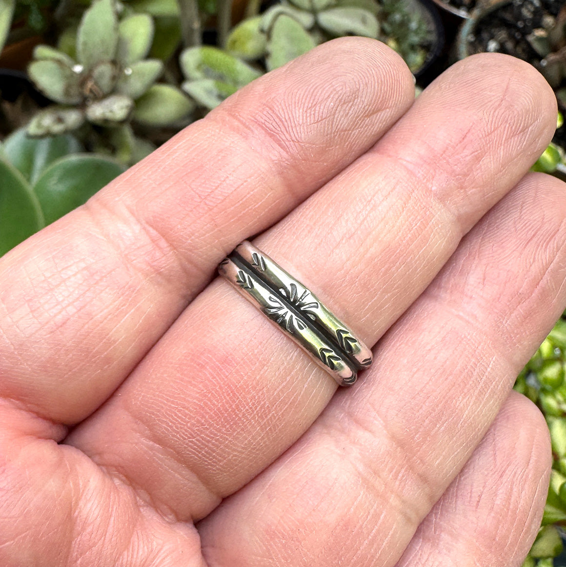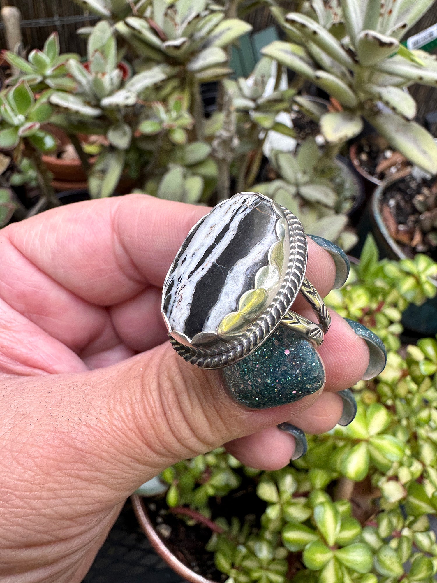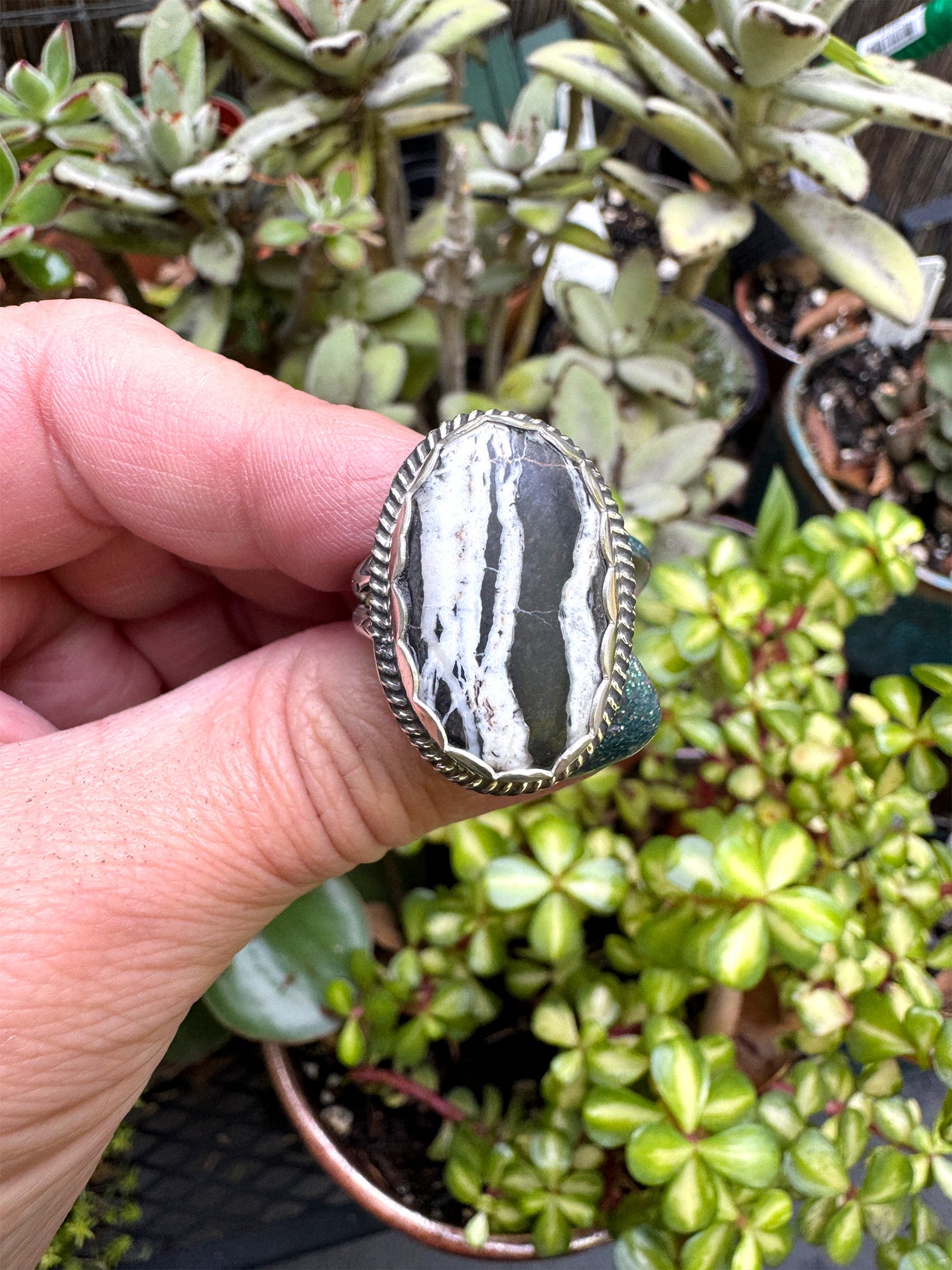Handmade sterling silver ring. Beautiful White Buffalo stone with a scalloped bezel. Beautiful detailed hand stamped split ring band.