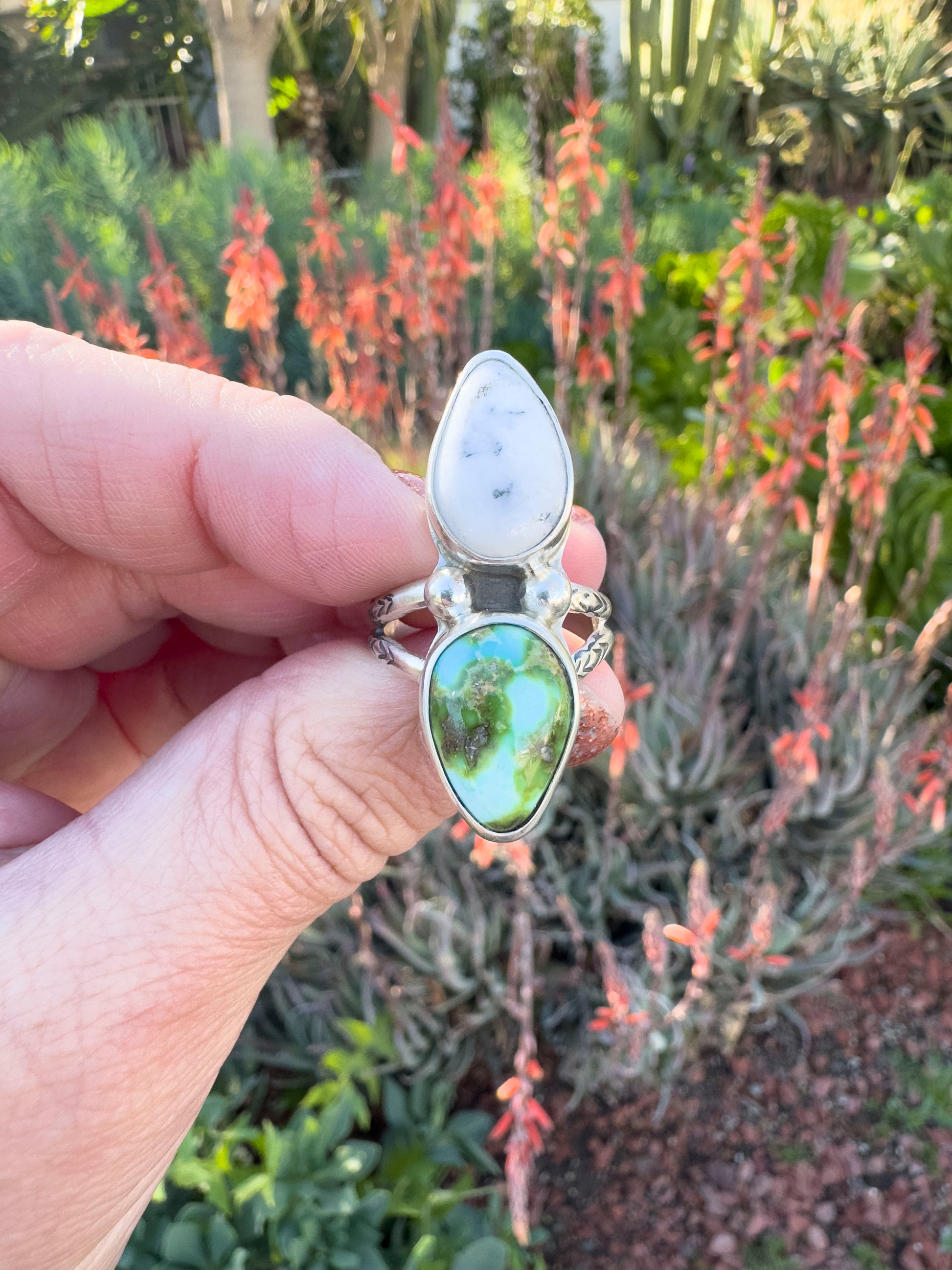Handmade sterling silver ring. Beautiful White Buffalo and Sonoran Blue Turquoise accent. Handmade bead accents