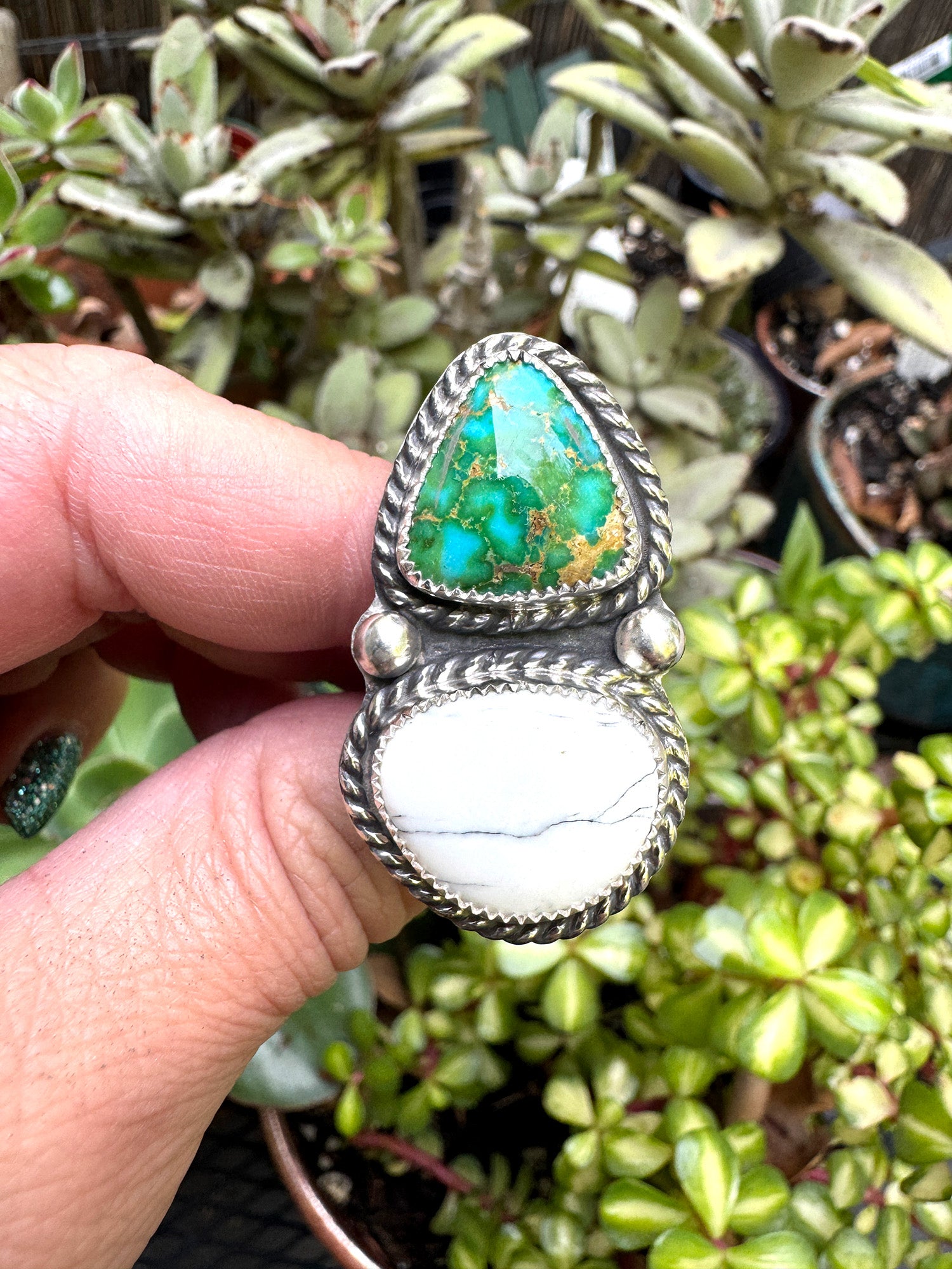 Handmade sterling silver ring. Beautiful White Buffalo and Sonoran Blue Turquoise accent. Handmade bead accents and a twist wrap.